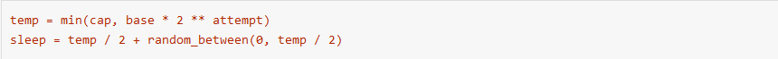 이러한 시간 제한 백오프 루프를 구현하는 몇 가지 방법이 있습니다. 위의 알고리즘을 "Full Jitter"라고 부르고 두 가지 대안을 고려해 보겠습니다. 첫 번째 대안은 "Equal Jitter"로, 항상 약간의 백오프와 지터를 유지합니다.