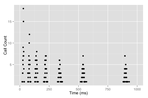 호출이 점점 덜 자주 발생한다는 점에서 지수 백오프가 작동하고 있음이 분명합니다. 문제는 또한 두드러집니다. 여전히 호출 클러스터가 있습니다. 모든 라운드에서 경쟁하는 클라이언트의 수를 줄이는 대신 경쟁하는 클라이언트가 없는 시간을 도입했습니다. 네트워크 지연의 자연스러운 변화로 인해 약간의 확산이 발생했지만 경합은 많이 줄어들지 않았습니다.