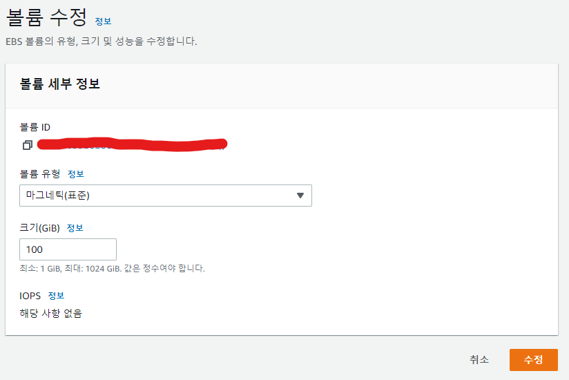 AWS 콘솔에서 간단하게 볼륨수정으로 물리적 용량을 확장시킬수 있습니다.