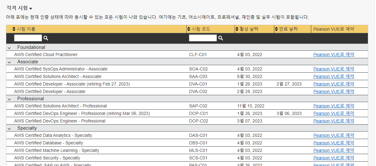 예약한시험(예정된 AWS 시험)과 시험볼수 있는 목록(적격 시험)이 나옵니다.