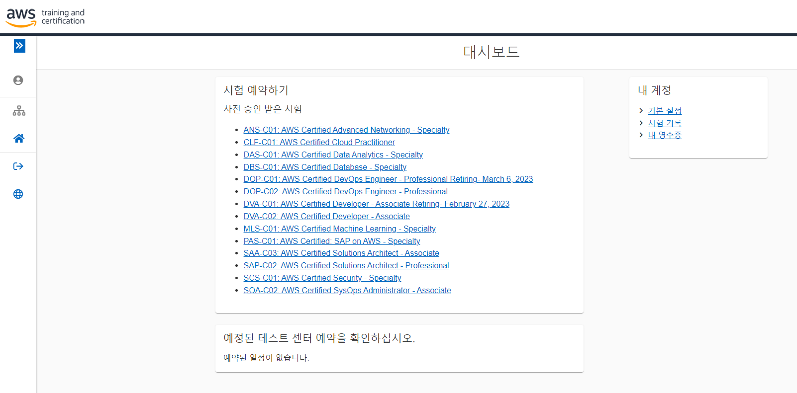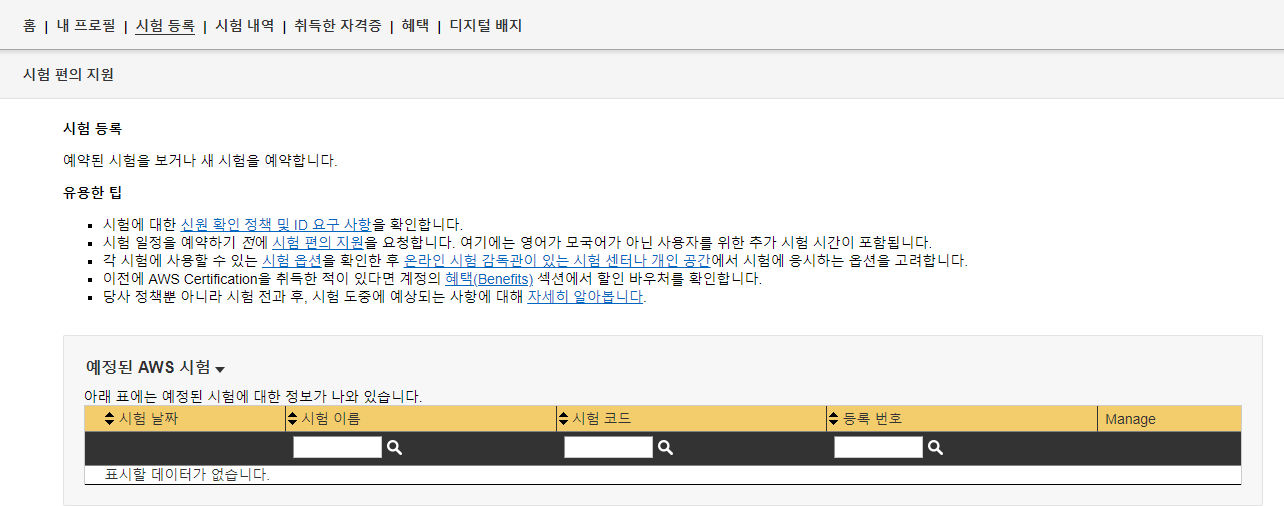 aws training certification에서는 시험등록 탭에서 예약한 시험을 확인할수 있습니다.