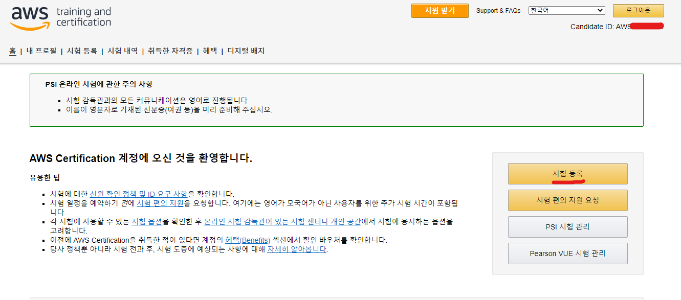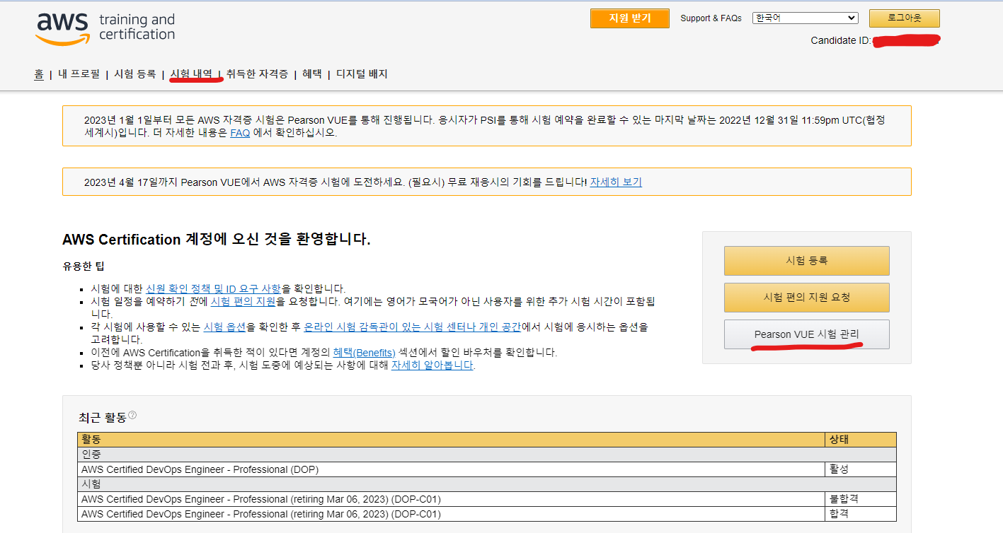 이전 PSI와 다르게 pearson vue 시험관리에서 관리와 aws certification에서 확인을 할수 있ㅅ브니다.