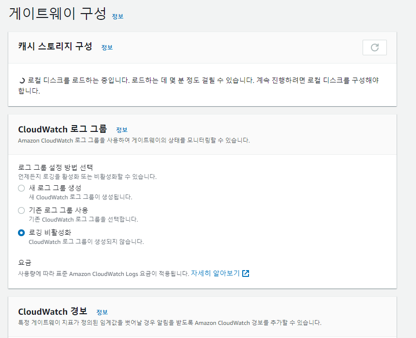 정상적으로 동작하면 캐시 스토리지 구성이 되는데 시간이 조금 걸립니다.
