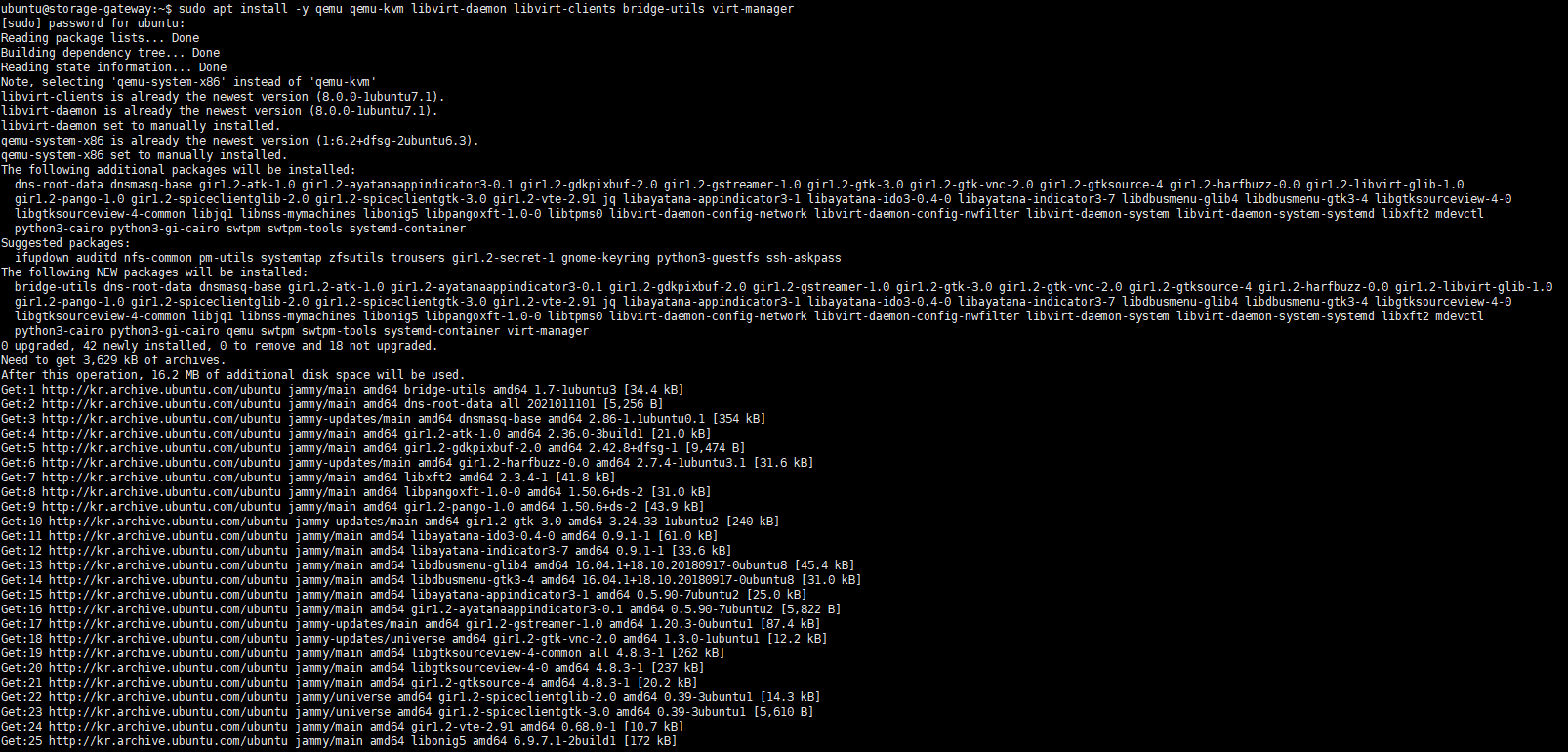 sudo apt install -y qemu qemu-kvm libvirt-daemon libvirt-clients bridge-utils virt-manager