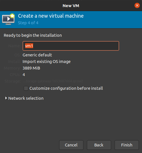 이제 VM의 이름을 적어주고(Network selection은 defualt로)