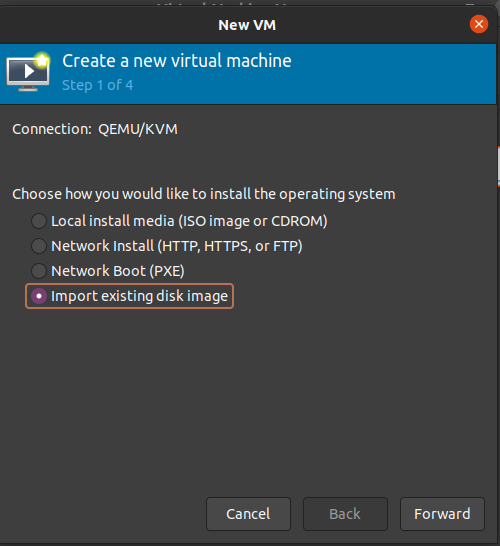 import existing disk image를 누르고 forward 합니다.