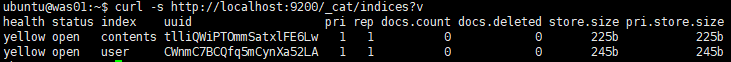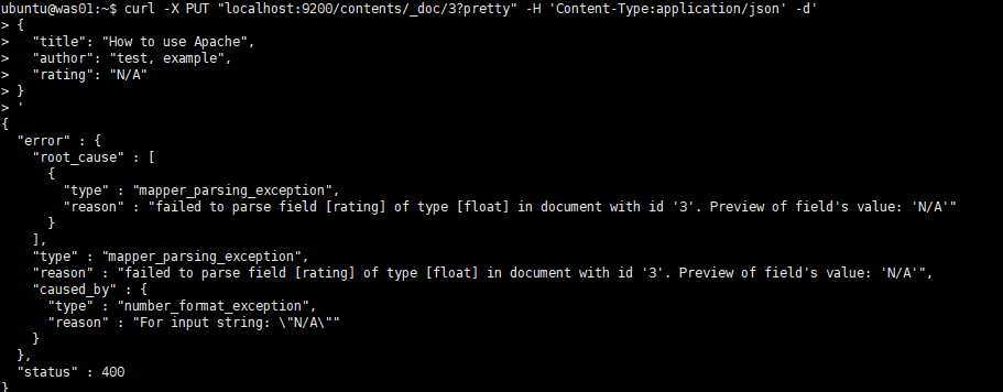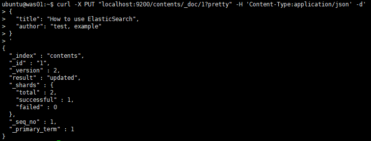 ubuntu@was01:~$ curl -X PUT "localhost:9200/contents/_doc/1?pretty" -H 'Content-Type:application/json' -d'