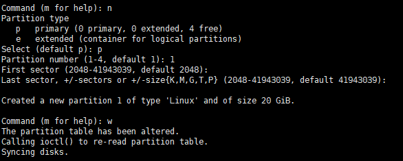 커맨드 n, p 후 기본값 입력후 마지막에 w 로 설정을 마무리합니다.