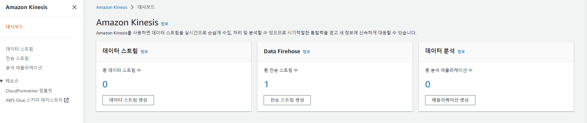 서비스 검색에서 firehose 검색하면 kinesis 나오는데 그걸 클릭하면 위와 같이 나옵니다.