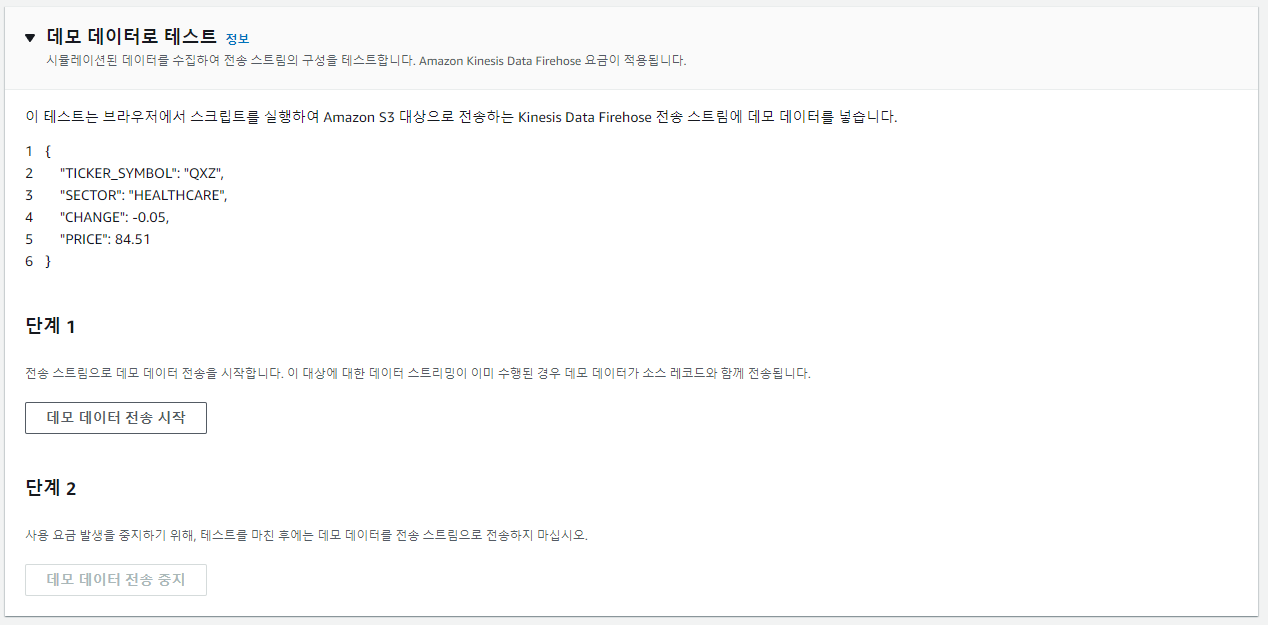 해당 aws kdf 에 가보면 데모데이터로 테스트라는게 있습니다.
