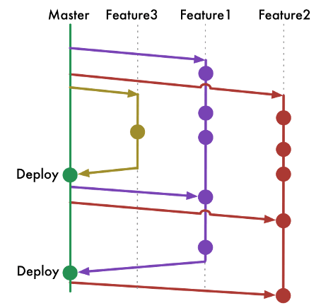 GitFlow와 달리 이 모델에는 릴리스 분기가 없습니다. 기본 브랜치로 시작한 다음 개발자는 마스터에서 직접 파생된 기능 브랜치를 생성하여 작업을 분리한 다음 다시 기본 브랜치로 병합합니다. 그런 다음 기능 분기가 삭제됩니다.