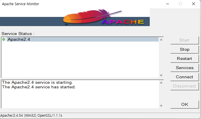 ApacheMonitor.exe 를 실행시켜 start를 입력하면 됩니다.