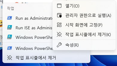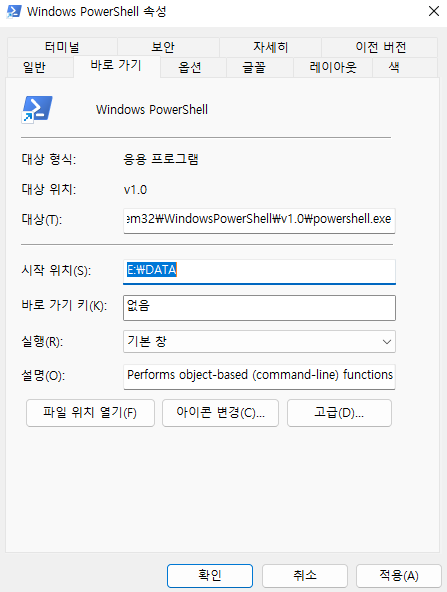 powershell 아이콘에서 오른쪽을 클릭하여 속성을 클릭하시거나