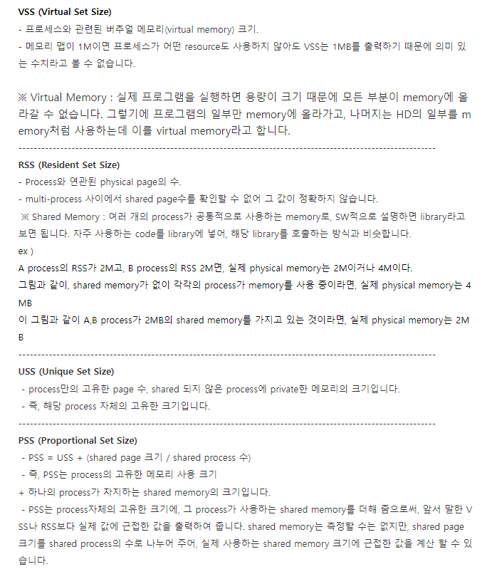 I read an explanation about VSS/RSS/PSS/USS: The aim of this post is to provide information that will assist in interpreting memory reports from various tools so the true memory usage for Linux