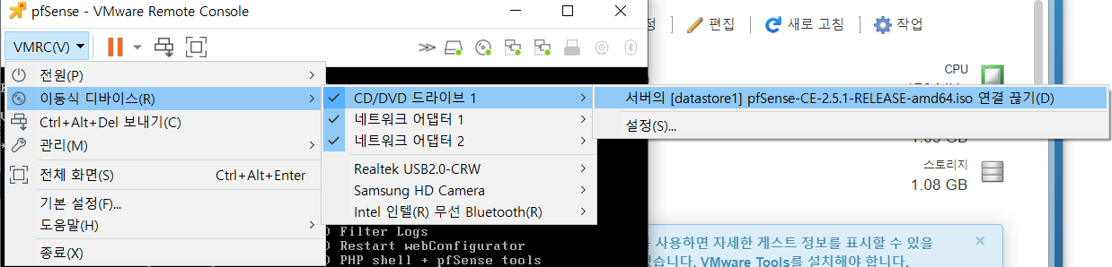 그다음 vmrc 상단에 메뉴를 누르고 이동식디바이스 - cd/dvd드라이브 위에 누르면 로컬에 있는 iso파일을 바로 갖다가 쓸수 있다.