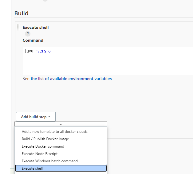 아무 freestyle 프로젝트하나 만들고 빌드에 Add build step - excute shell 에 java -version을 입력하고 저장한뒤 빌드합니다.