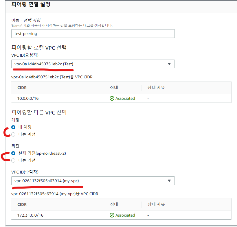 피어링을 받을 vpc 리전이나 계정의 피어링 연결로 들어갑니다.