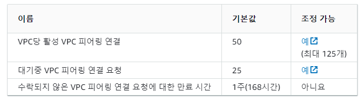 VPC당 활성 및 보류 중인 VPC 피어링 연결 수에는 할당량이 있습니다.