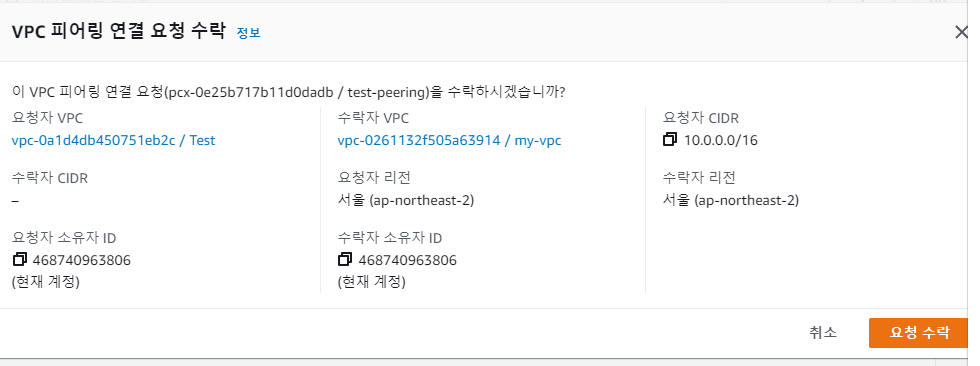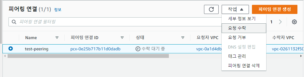 피어링 연결한 대상을 선택후 작업에서 요청수락을 클릭합니다.