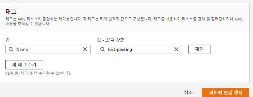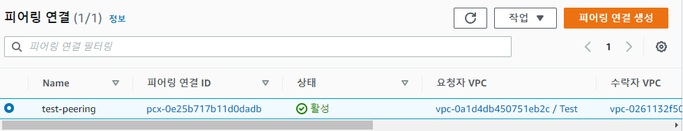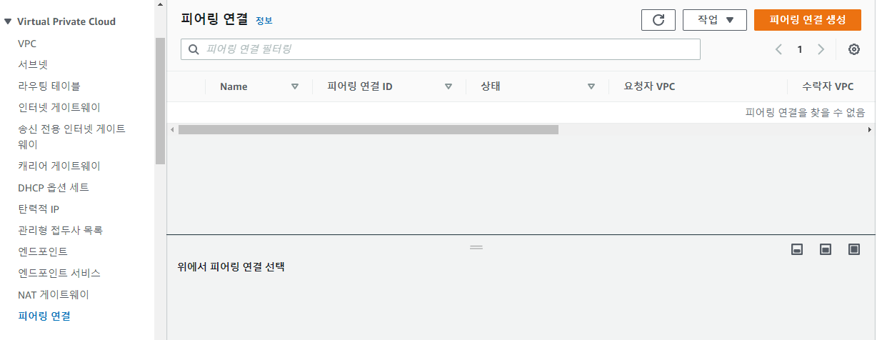 AWS에서 VPC 서비스에 들어간뒤 왼쪽에 피어링 연결을 클릭하면 위와 같은 화면이 나옵니다.