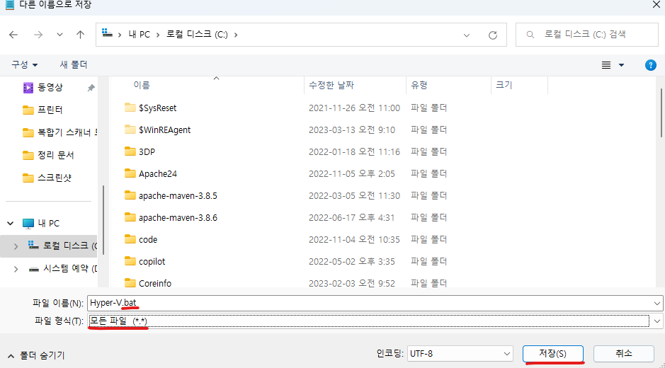 앞에 이름은 상관없는데 확장자를 .bat으로 입력하고