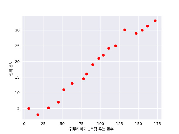 오랫동안 귀뚜라미는 시원날 날보다 더운 날 더 자주 우는 것으로 알려져 왔습니다. 전문가 및 아마추어 곤충 학자들이 수십 년에 걸쳐서 1분당 귀뚜라미가 우는 횟수와 온도에 관한 데이터를 목록으로 작성했습니다. 고모가 생일 선물로 두 특성의 관계를 예측하는 모델을 학습시켜 보라고 아끼던 귀뚜라미 데이터베이스를 줬다고 해 봅시다.