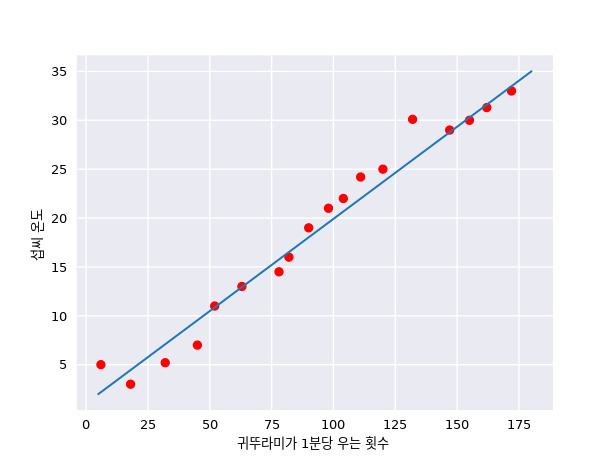 예상대로 그래프를 통해 우는 횟수가 증가할수록 온도가 올라가는 것을 확인했습니다. 우는 횟수와 온도는 선형 관계일까요? 네. 이 관계를 근사치로 하는 다음과 같은 하나의 직선을 그릴 수 있습니다.