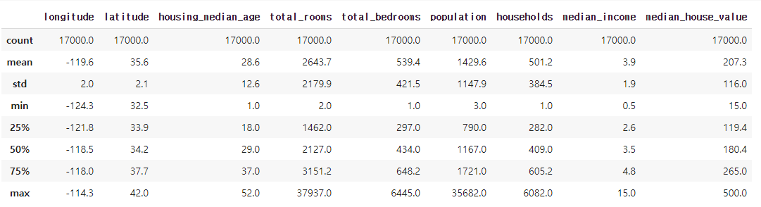 각 열에 대해 예의 개수, 평균, 표준편차, 최대값, 최소값, 다양한 분위 등 몇 가지 유용한 통계를 간단히 요약하여 출력해 보겠습니다.