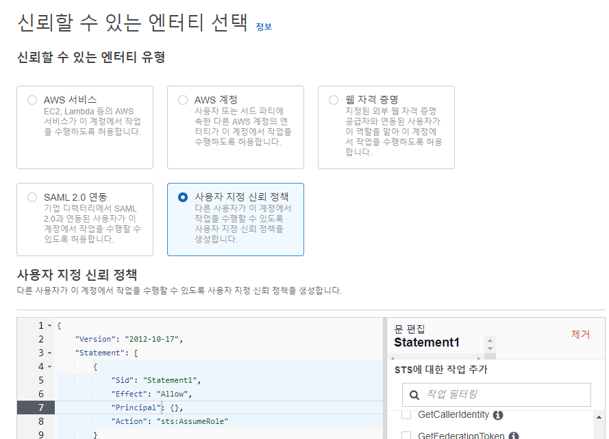 신뢰할 수 있는 엔터티 선택에서 사용자 지정 신뢰 정책을 선택한다.