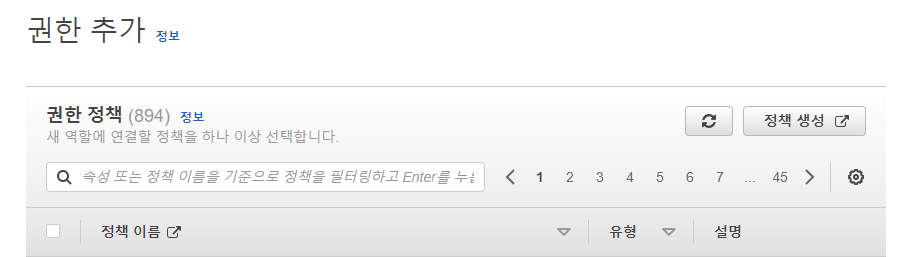 다음으로 넘어가면 권한 정책 설정이 나오는데 정책 생성을 클릭하여 다음 정책을 추가하고 선택한뒤 다음으로 넘어가자