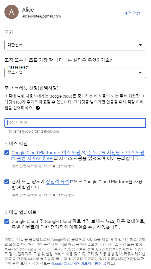 무료로 시작하기를 클릭하면 로그인을 한뒤 가입정보 입력란이 나옵니다.