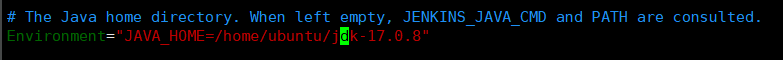 JENKINS_JAVA_CMD를 검색하여 Enviornment를 주석해제후 위에서 복사한 경로를 붙여넣어주자
